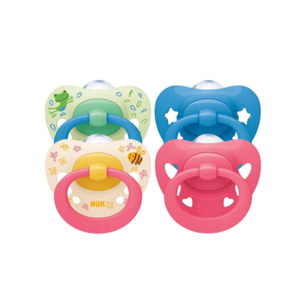 Chupete Signature NUK de silicona diseñado para el desarrollo general saludable de los bebés, escudo bucal en forma de corazón con formas fluidas y suaves, reduce la presión sobre mandíbulas y dientes, tetina plana y parte inferior lisa, para más libertad para el movimiento de succión natural.