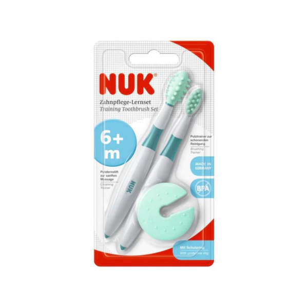 • Paso 2: El cepillo de entrenamiento NUK con puntas de goma blanda, resistente a las mordidas, para la primera limpieza suave.